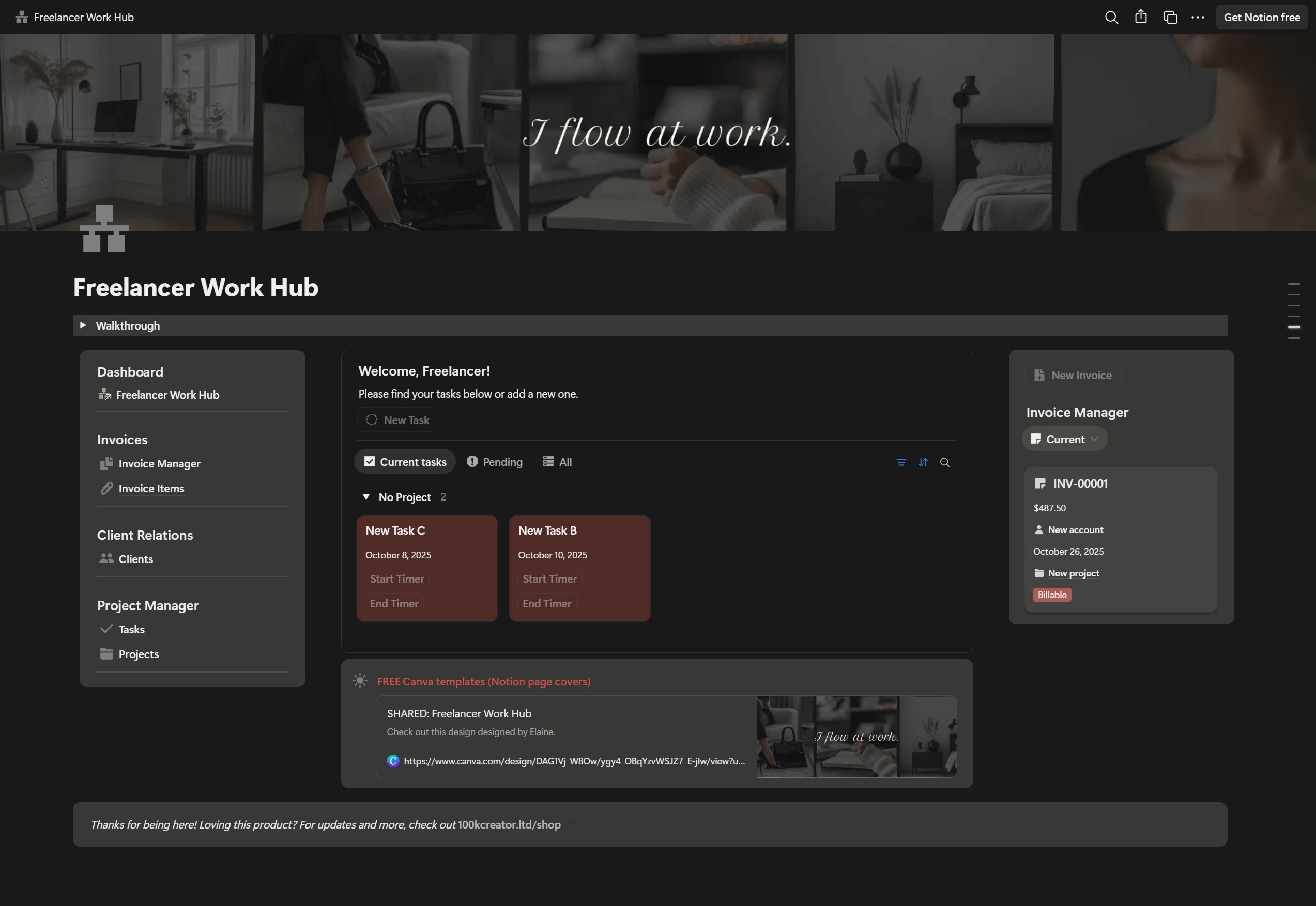 - A Notion template to organize your work, reduce mental load, track invoices, projects, tasks, and clients in one hub.
