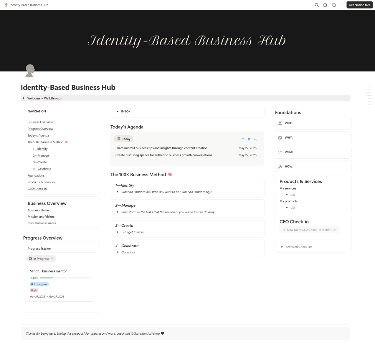 • A Notion hub to show your business foundations, including CEO Check-ins, your tasks for the day, AND your progress towards your desired goals.